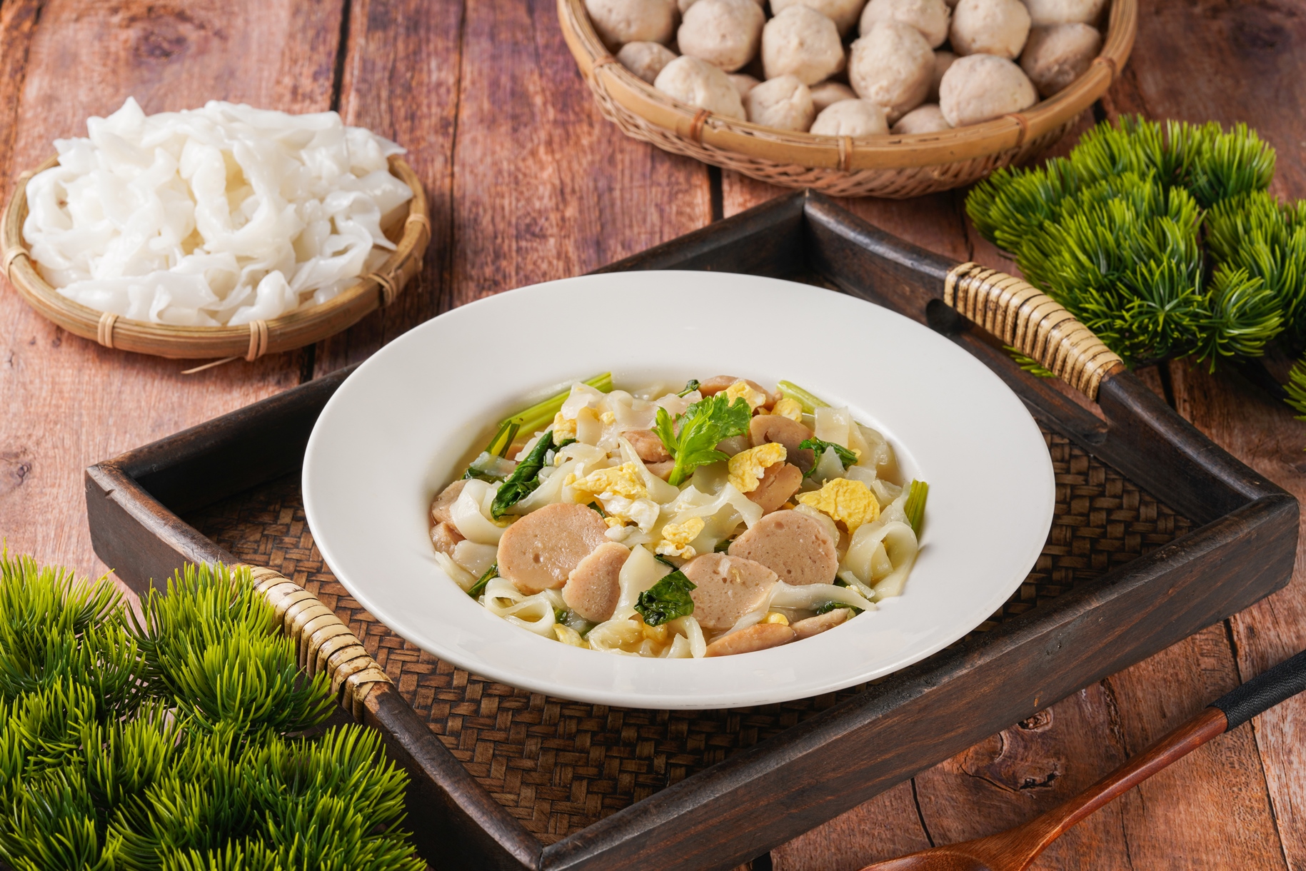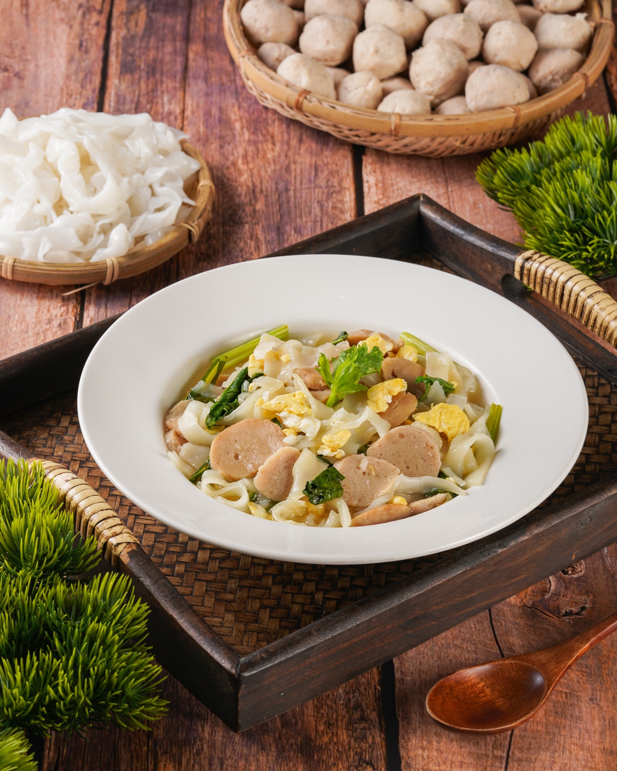 1. Boil kwetiaw with hot water then drain immediately. In a bowl, mix kwetiaw with sesame oil and soy sauce. Stir well. Set aside.